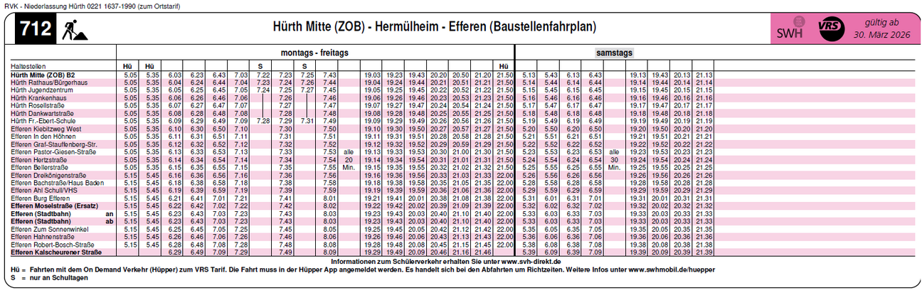Die Busse der Linie 712 werden in Fahrtrichtung Efferen Stadtbahn über die Bachstraße, die Beselerstraße, die Kochstraße und dann weiter auf dem normalen Linienweg umgeleitet. Die Haltestelle „Moselstraße“ entfällt in diesem Zeitraum. Die Haltestelle „Burg Efferen“ sowie eine weitere Ersatzhaltestelle in der Kochstraße zwischen Hausnummer 1 und 1a werden als Ersatzhaltestellen eingerichtet.